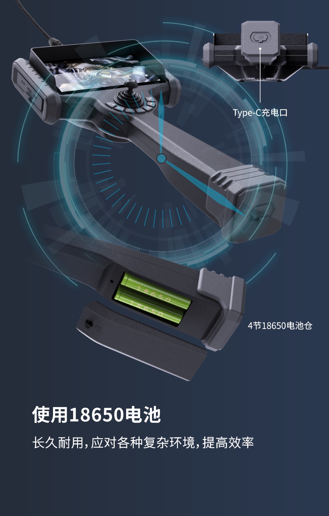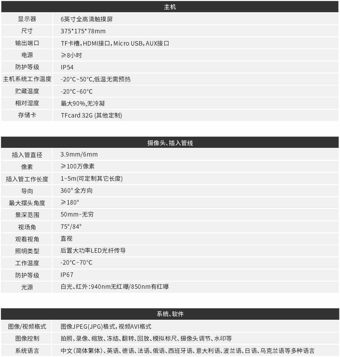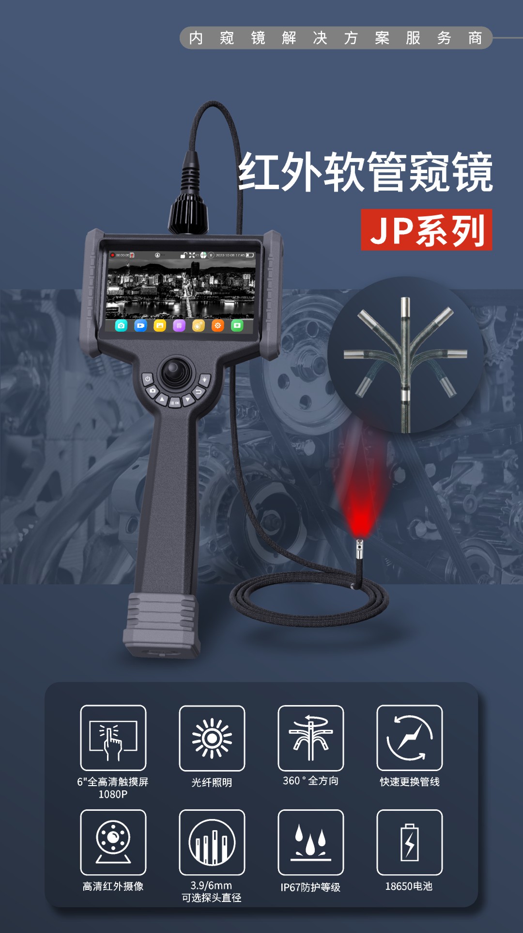 優(yōu)勢特點:紅白雙光源;6英寸大屏;雙電路設計,單節(jié)電池也能工作;360°旋轉探頭