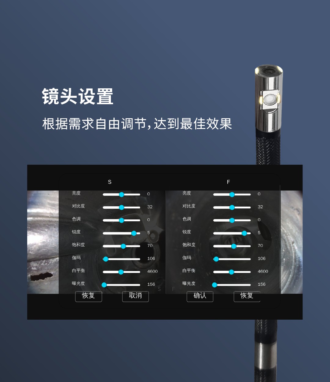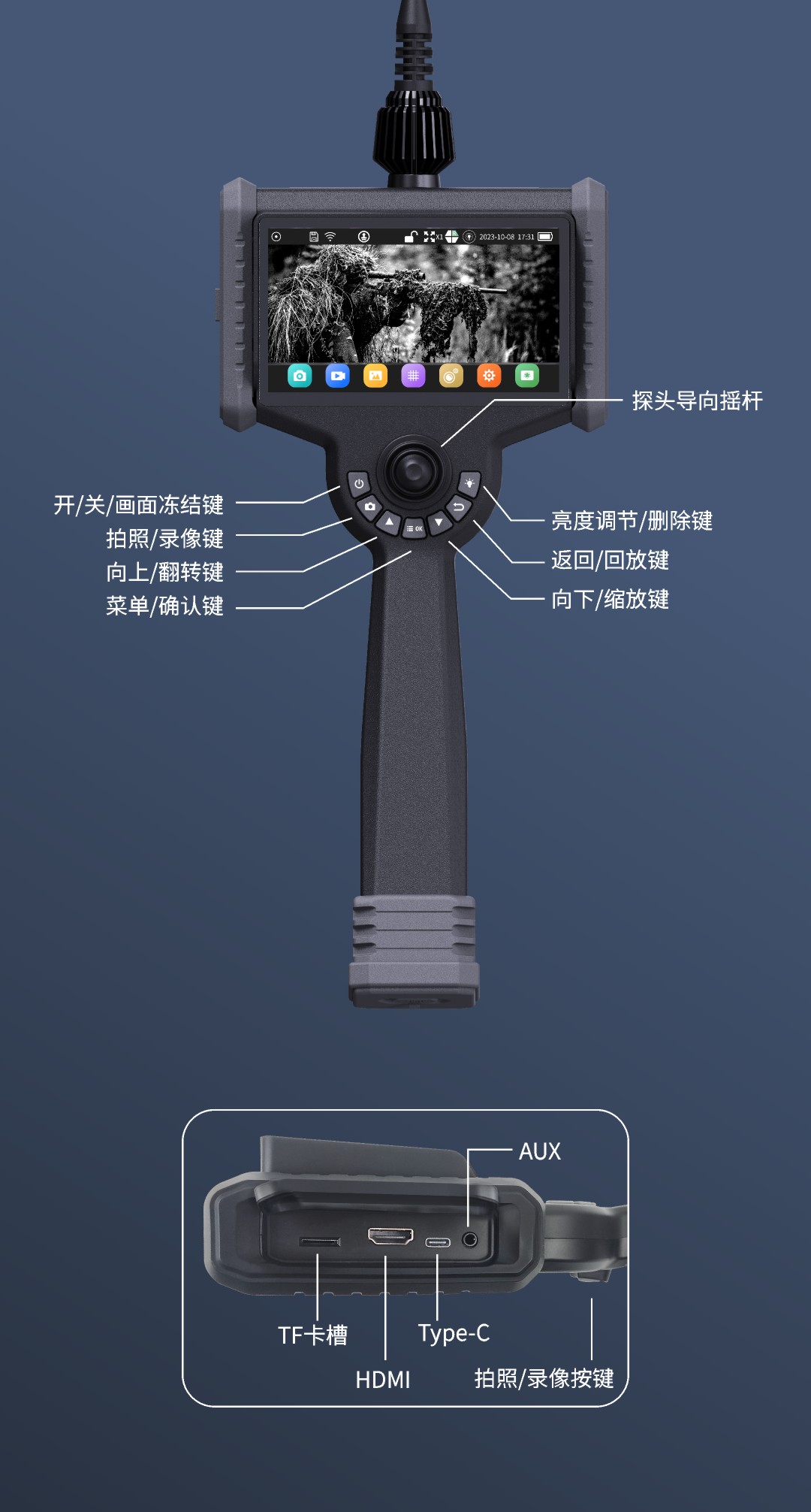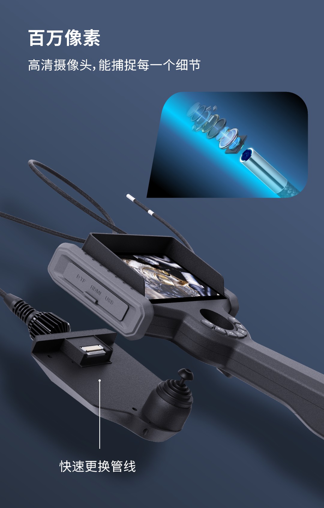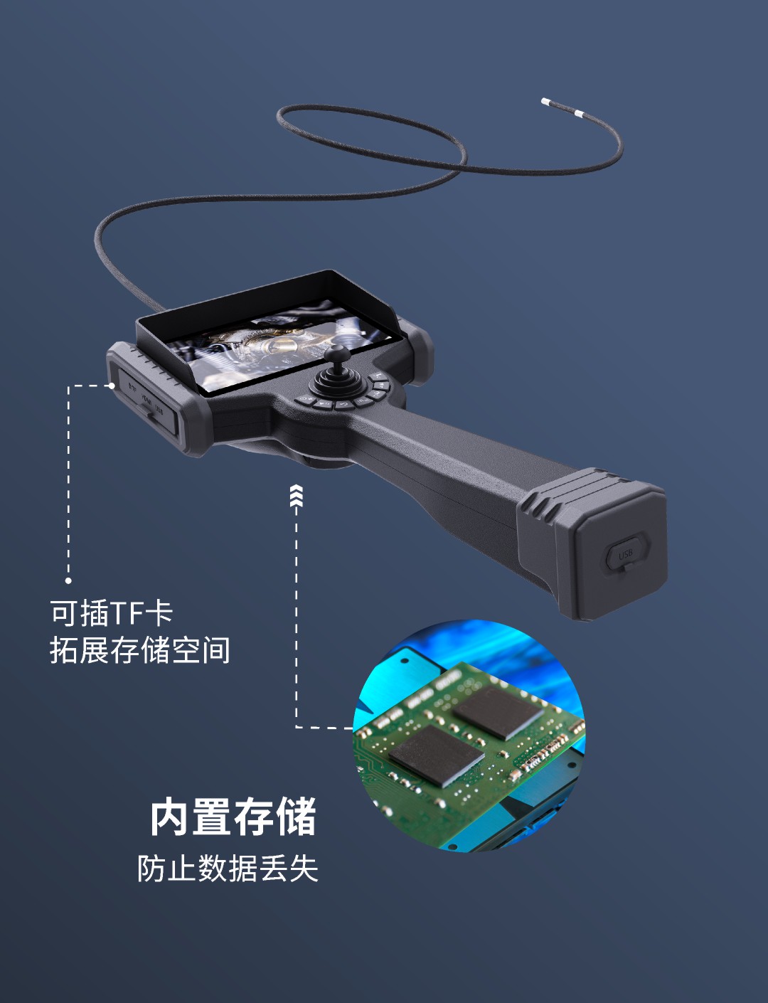 優(yōu)勢特點:紅白雙光源;6英寸大屏;雙電路設計,單節(jié)電池也能工作;360°旋轉探頭